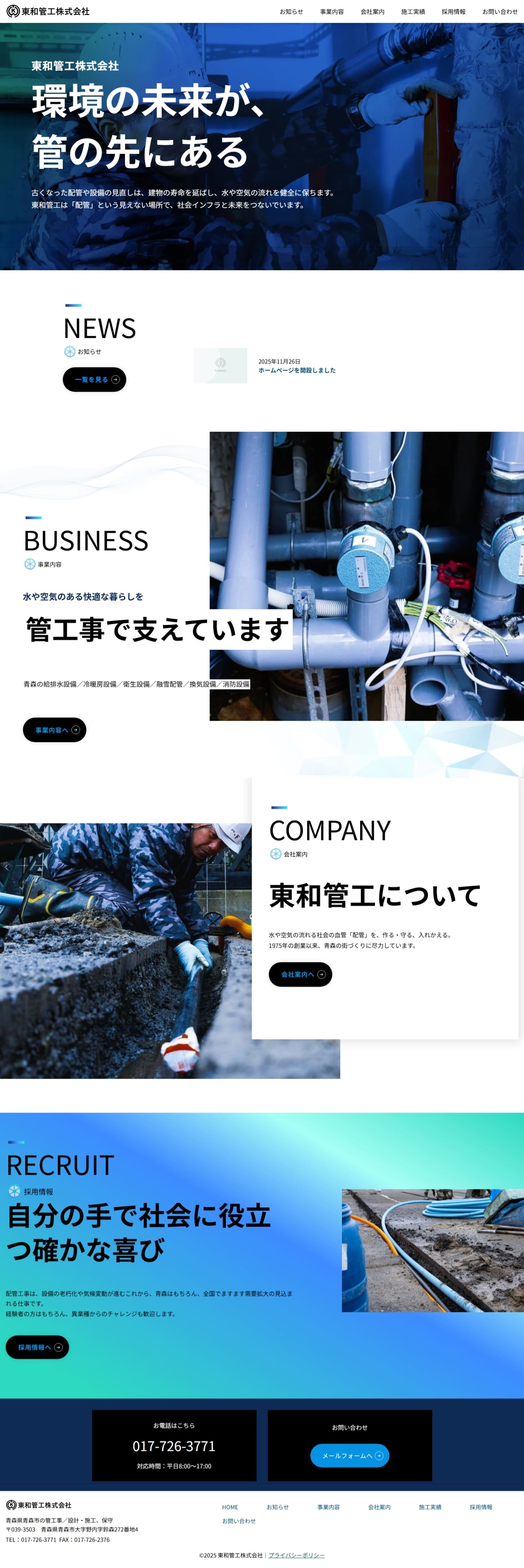 東和管工株式会社様コーポレートサイトを制作 青森市の管工事会社・東和管工株式会社様の公式Webサイトを制作しました。 ポイント 写真を使った印象的なデザイン 工事に携わる方の風景を撮影し、印象的な写真に仕上げました。 新規制作なので、今後の更新がしやすいように施工実績の入力を簡易にするなどの工夫をしています。